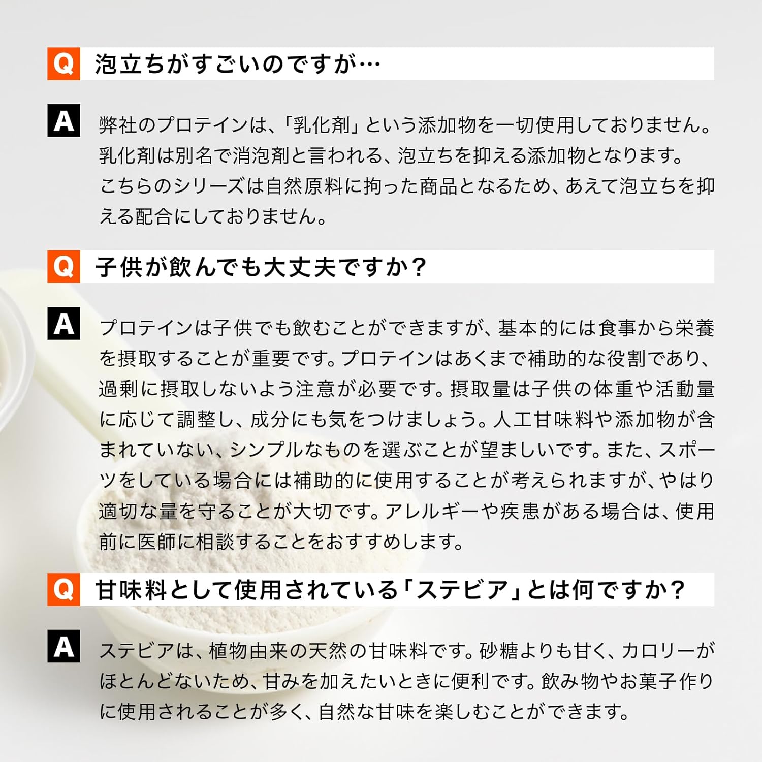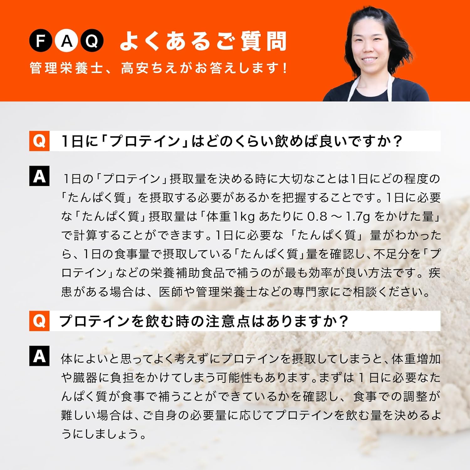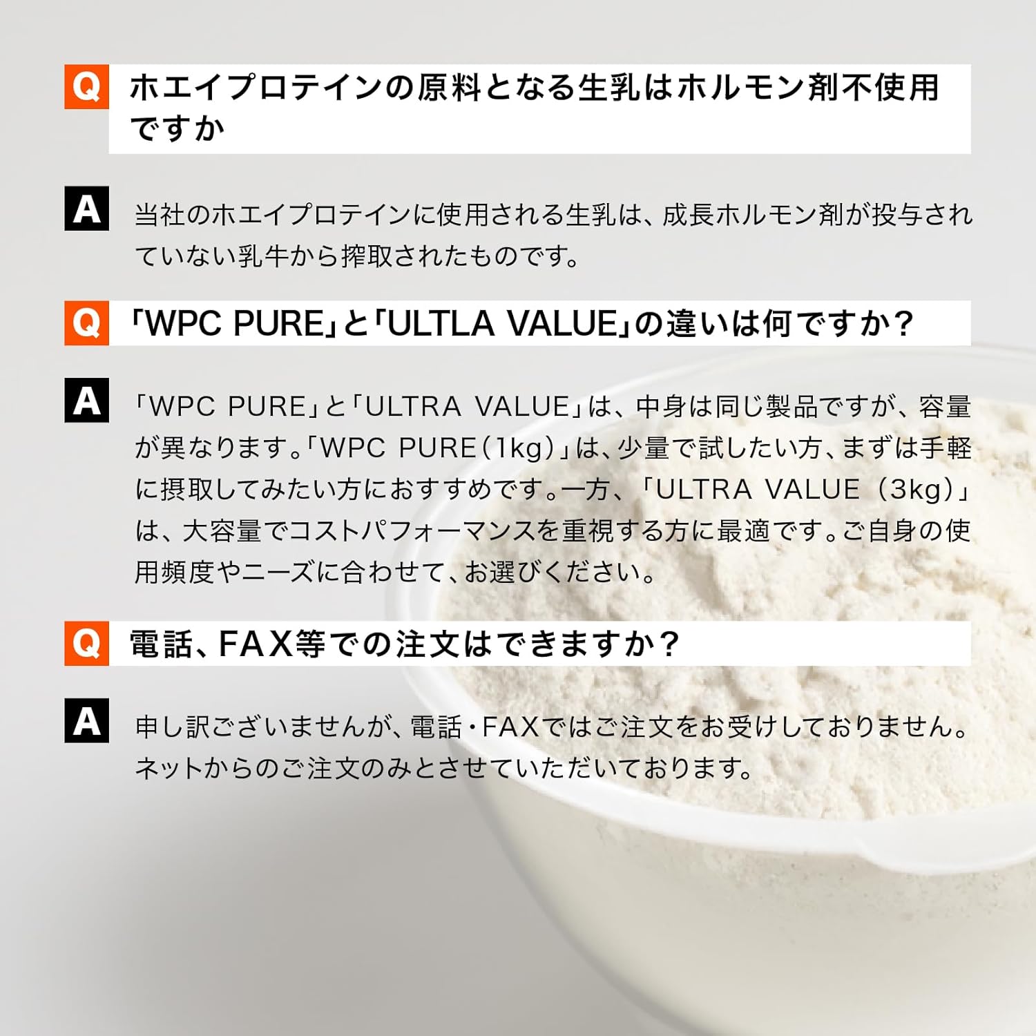 1日の「プロテイン」 摂取量を決める時に大切なことは1日にどの程度の 「たんぱく質」 を摂取する必要があるかを把握することです。 1日に必要 な「たんぱく質摂取量は「体重1kgあたりに 0.8~1.7g をかけた量」 で計算することができます。 1日に必要な「たんぱく質量がわかったら、1日の食事量で摂取している「たんぱく質」量を確認し、不足分を「プロテイン」などの栄養補助食品で補うのが最も効率が良い方法です。疾患がある場合は、医師や管理栄養士などの専門家にご相談ください。 プロテインを飲む時の注意点はありますか? 体によいと思ってよく考えずにプロテインを摂取してしまうと、体重増加や臓器に負担をかけてしまう可能性もあります。 まずは1日に必要なたんぱく質が食事で補うことができているかを確認し、食事での調整が 難しい場合は、ご自身の必要量に応じてプロテインを飲む量を決めるようにしましょう。 「WPC PURE」 と 「ULTLA VALUE」の違いは何ですか? 「WPC PURE」と「ULTRA VALUE」 は、中身は同じ製品ですが、容量が異なります。「WPC PURE (1kg)」は、少量で試したい方、まずは手軽に摂取してみたい方におすすめです。 一方「ULTRA VALUE (3kg)」は、大容量でコストパフォーマンスを重視する方に最適です。ご自身の使用頻度やニーズに合わせてお選びください。 ホエイプロテインの原料となる生乳はホルモン剤不使用ですか? 当社のホエイプロテインに使用される生乳は、成長ホルモン剤が投与されていない乳牛から搾取されたものです。 泡立ちがすごいのですが... 弊社のプロテインは、「乳化剤」という添加物を一切使用しておりません。乳化剤は別名で消泡剤と言われる、 泡立ちを抑える添加物となります。 こちらのシリーズは自然原料に拘った商品となるため、あえて泡立ちを抑える配合にしておりません。