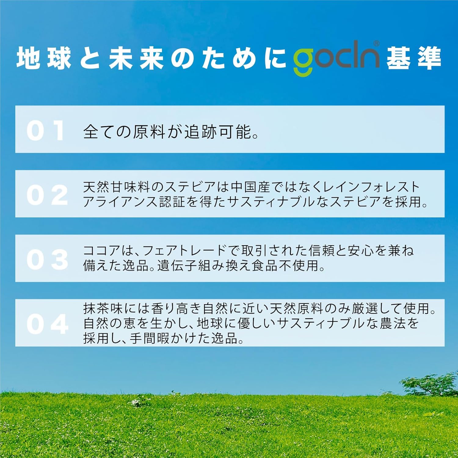 グラスフェッド=放牧飼育。北欧のノルウェーでは、牛本来の生態に寄り添う伝統的な酪農方法が受け継がれてきました。温室効果ガスも屈指の低排出量であることにも注目です! 生産者まで追跡可能な植物性プロテイン! この起源原料である大豆・えんどう豆・米は、その生産者まで追跡が可能です。それぞれの生産者が真摯に向き合い大切に育てられた農産物は、栄養価が高いだけではなく、素材の美味しさが引き立っています。 この農産物を原料としたプロテインは、アメリカ・ヨーロッパの植物タンパク加工先進国の製造技術を用いて作り出されています。 伝統からもたらされる恩恵に、現代のテクノロジーを組み合わせて作り出されたこの原料を、環境保全に配慮した国内協力工場で、大切に愛情を込めて、gocln Plant-Based Proteinに仕上げました。 さあ、人生100年の時代です。 あなたは何を選びますか?