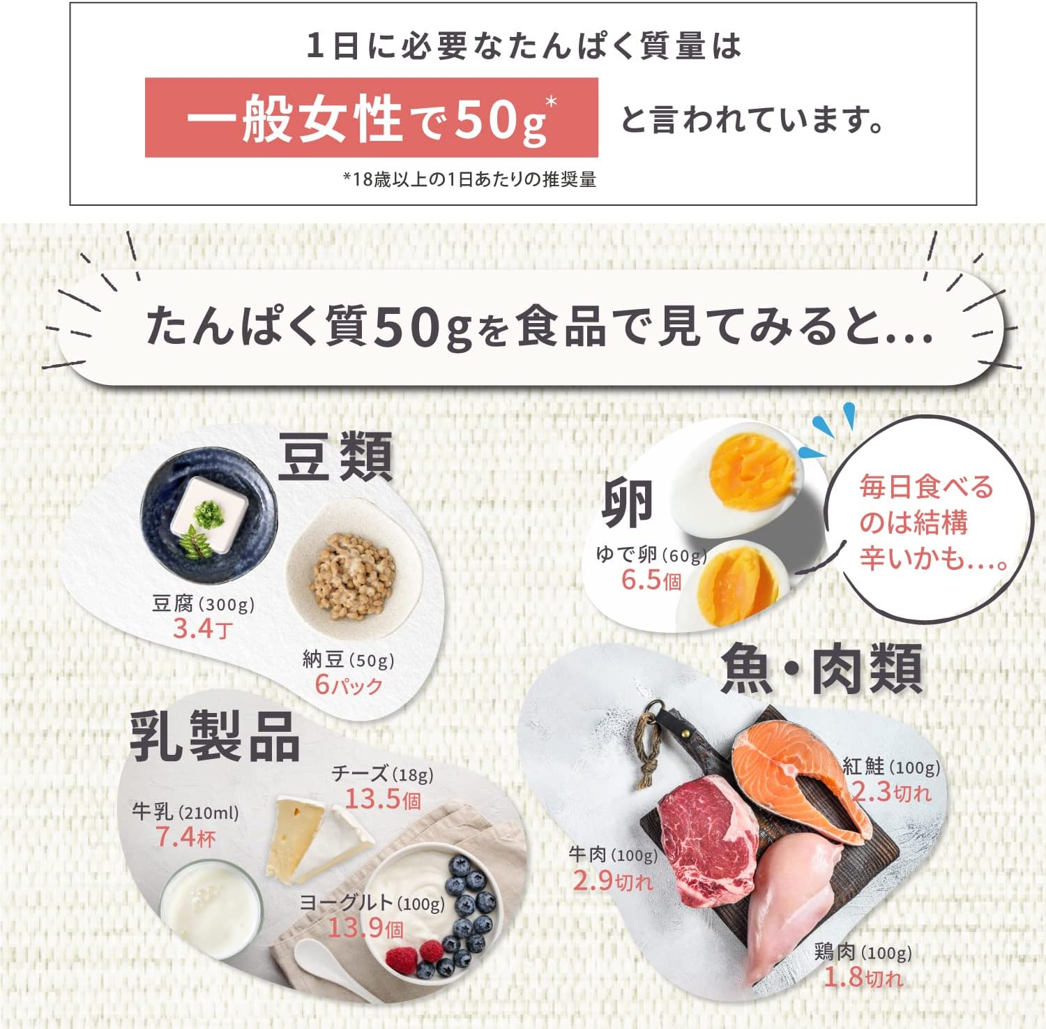 エネルギー 73.4kcal たんぱく質 16.0g 炭水化物 0.8g 脂質 0.7g 食塩相当量 0.3g 難消化性デキストリン(食物繊維) 341.7mg 鉄 2.5mg カルシウム 110mg マグネシウム 60mg ビタミンA 215μg ビタミンB6 0.4mg ビタミンB12 0.6μg ビタミンC 25mg ビタミンE 1.8mg ビタミンD3 1.5μg たんぱく質含有量 85.5%(製品無水物あたり)