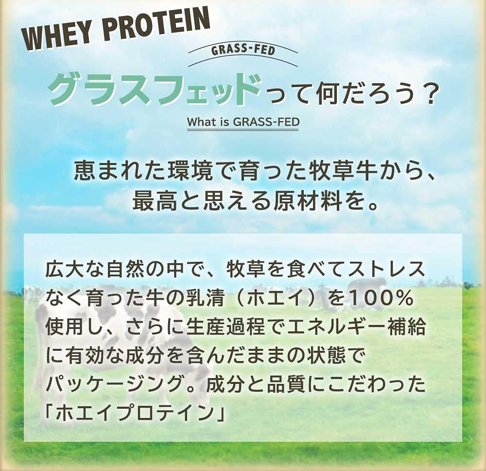 香料・着色料・保存剤・人工甘味料を使用せず、体に優しいプロテインをご提供致します。 カラダうれしい自然派プロテイン たんぱく含有量が81%以上のグラスフェッドホエイプロテインを使用しています。(無水換算あたり) 選ばれる理由 牧草牛の乳清のみを使用人工香料・人工甘味料・GMO一切不使用タンパク質高含有