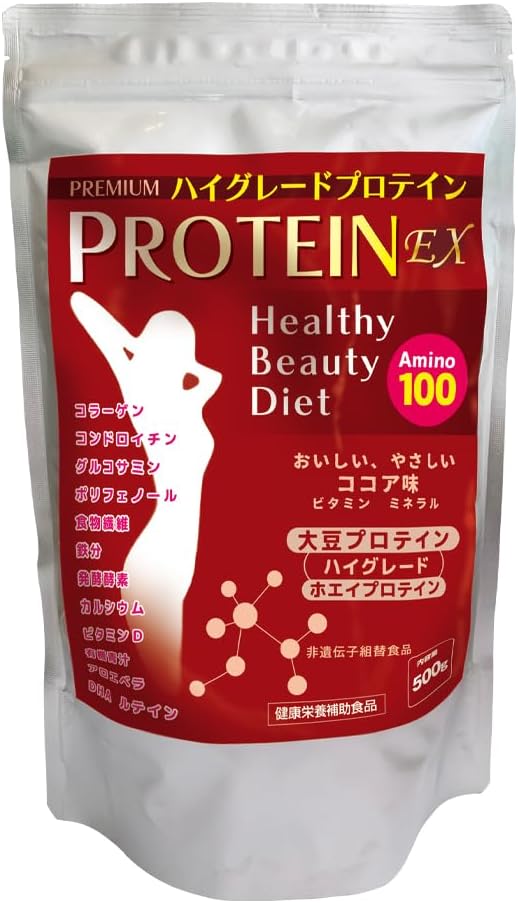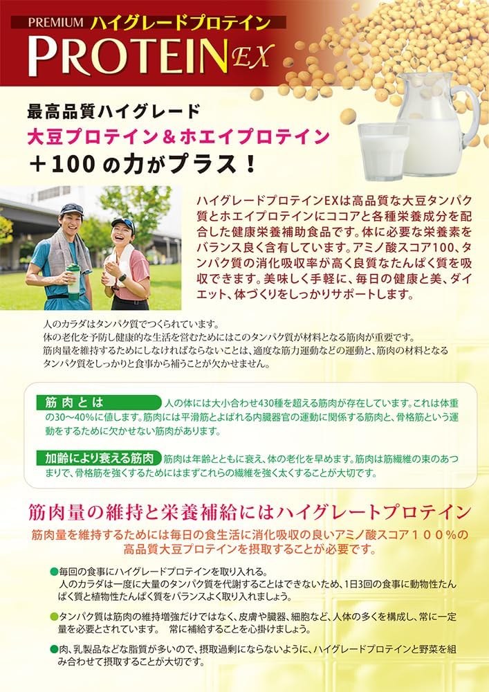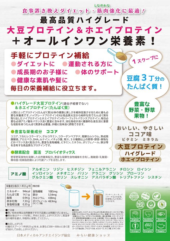 - •★★高品質 ハイグレードプロテインEX (大豆プロテインプ+自然グラスフェッドホエイプロテイン)のダフル タンパク質パワーのプロテインです! ★★60種類の栄養成分、ビタミン、ミネラル、アミノ酸、コラーゲン、ルテイン、酵素、食物繊維、カルシウムなどを配合したバランス栄養プロテインです。 ★★高品質ココア! 上品な自然な甘さのとっても美味しいココア味です。豊富なポリフェノール、エラグ酸を含有。 ★★高品質の大豆から純粋なプロテインを抽出したハイグレードなソイプロテイン(大豆ソイプロテイン国内製造/遺伝子組み換えでない) ★★高吸収 高たんぱく質 プロテイン ★★アミノ酸スコア100 【1食で、豆腐3丁分のタンパク質が摂取できます!】 ★★高品質の大豆から純粋なプロテインを抽出したハイグレードなプロソイテイン ★★60種類の各種有用成分がオールインワンされているトータルバランス栄養食プロテイン! 【豊富な高品質ココアたっぷり】自然な優しい美味しさ! とっても美味しい! 【低カロリー/1食94カロリー】 ★★高たんぱく質 プロテインの体内吸収が高いです。 ★★ ふかひれコラーゲン、コンドロイチン、ビタミン、ミネラル、アミノ酸、自然酵素、カルシウム、発酵性食物繊維 イヌリン、酵素、ルテイン、DHA、ポリフェノール、青汁、アロエベラ、鉄分などを配合しています。 ★★高品質なタンパク質を美味しく効率的に摂取できます。