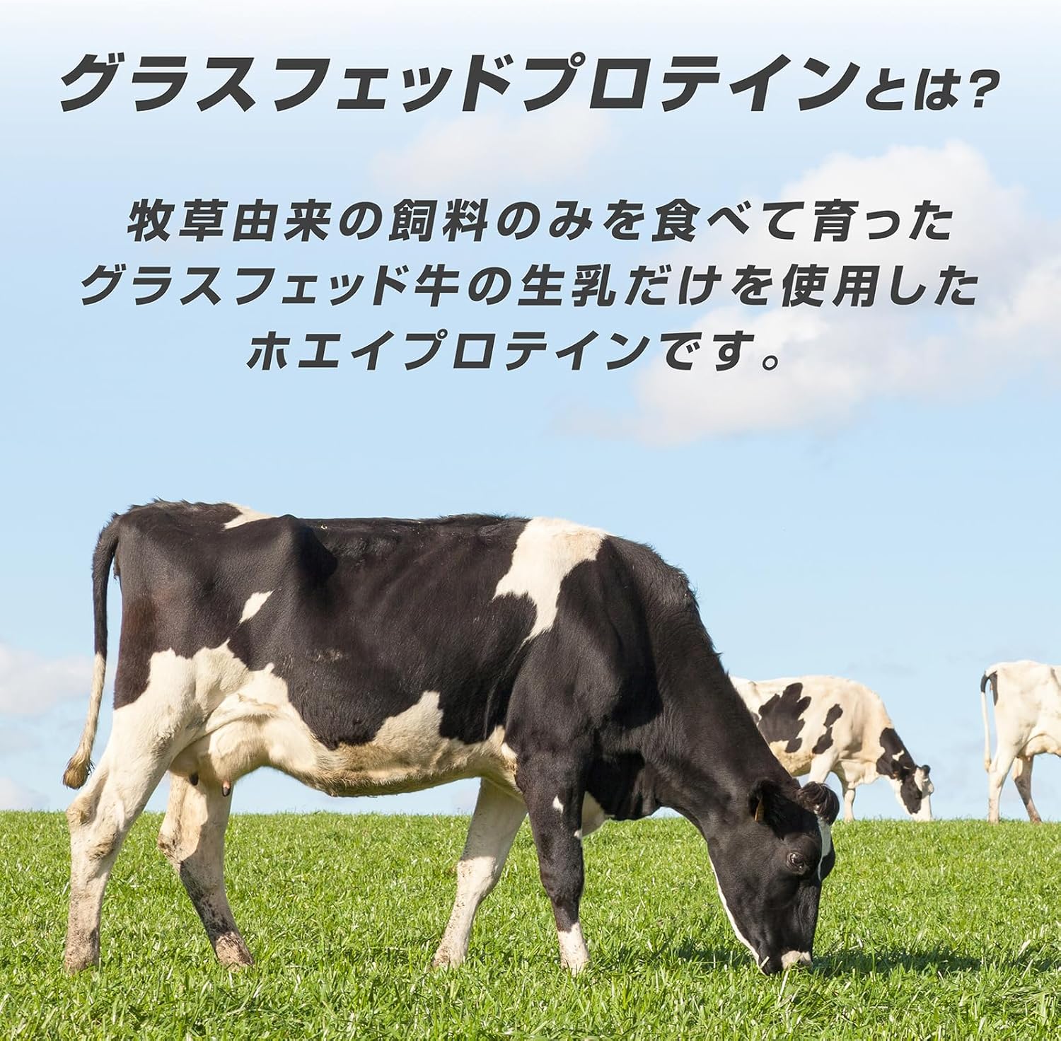 - •【グラスフェッドプロテインとは】牧草由来の飼料のみを食べて育ったグラスフェッド牛の生乳だけを使用したホエイプロテインです