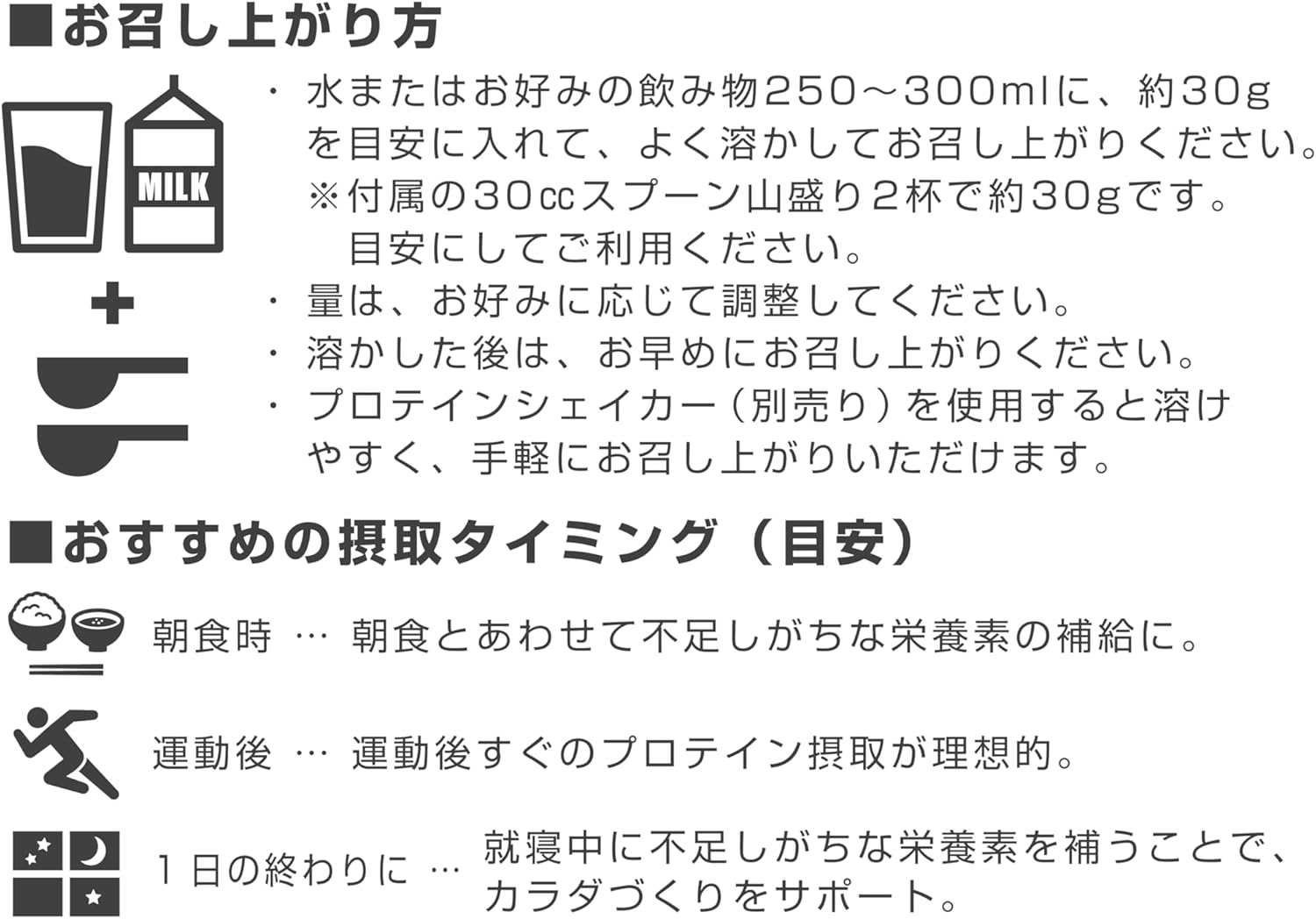 - •【お客様へのご注意】当商品は泡立ちを抑える添加物を使用していないため、一般的なプロテインと比較して、泡立ちが多い商品です。シェイカーなどでドリンクを作る際に泡立ちが気になる方は、シェイク後に数分置いてからお召し上がりください