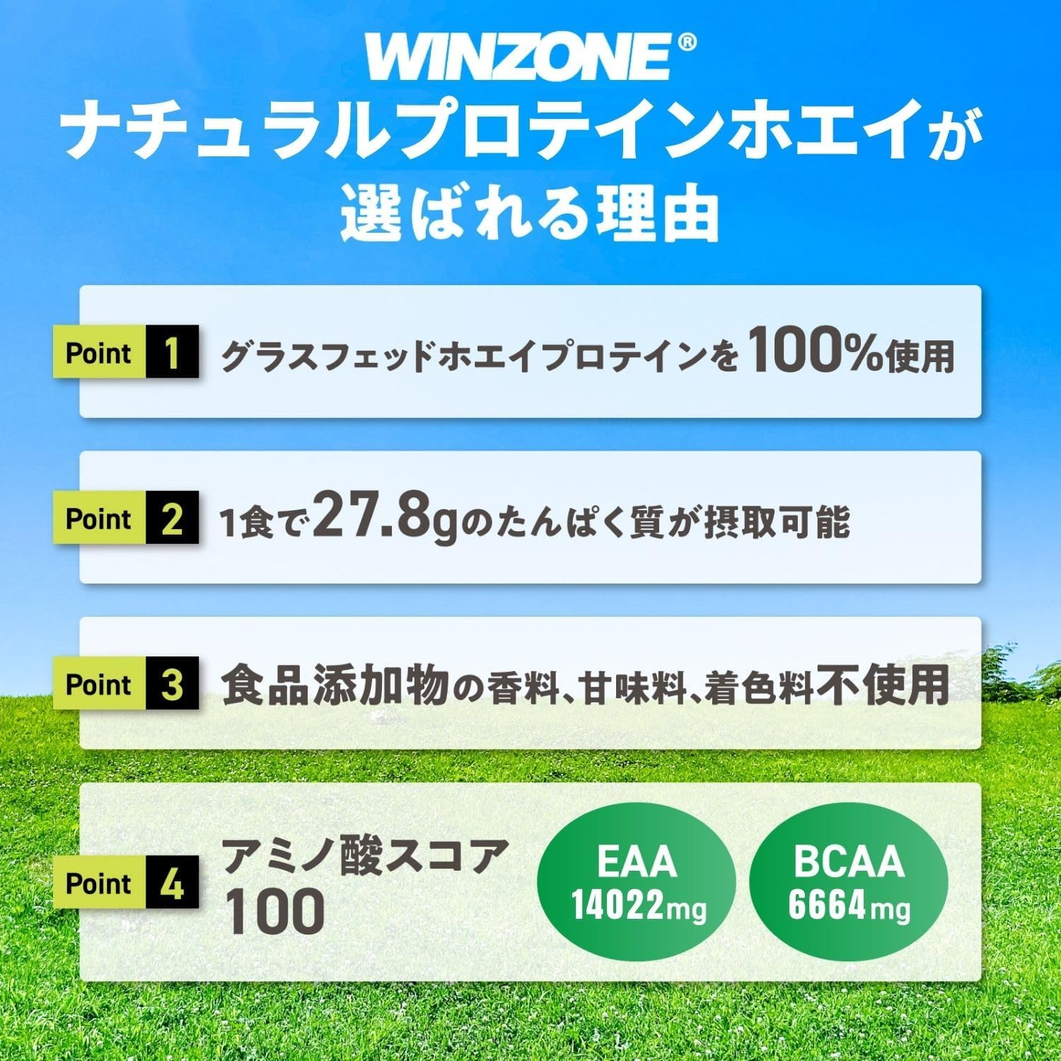 WINZONE ナチュラルプロテイン ホエイ 1kg グラスフェッド 甘味料・着色料・香料不使用 日本新薬