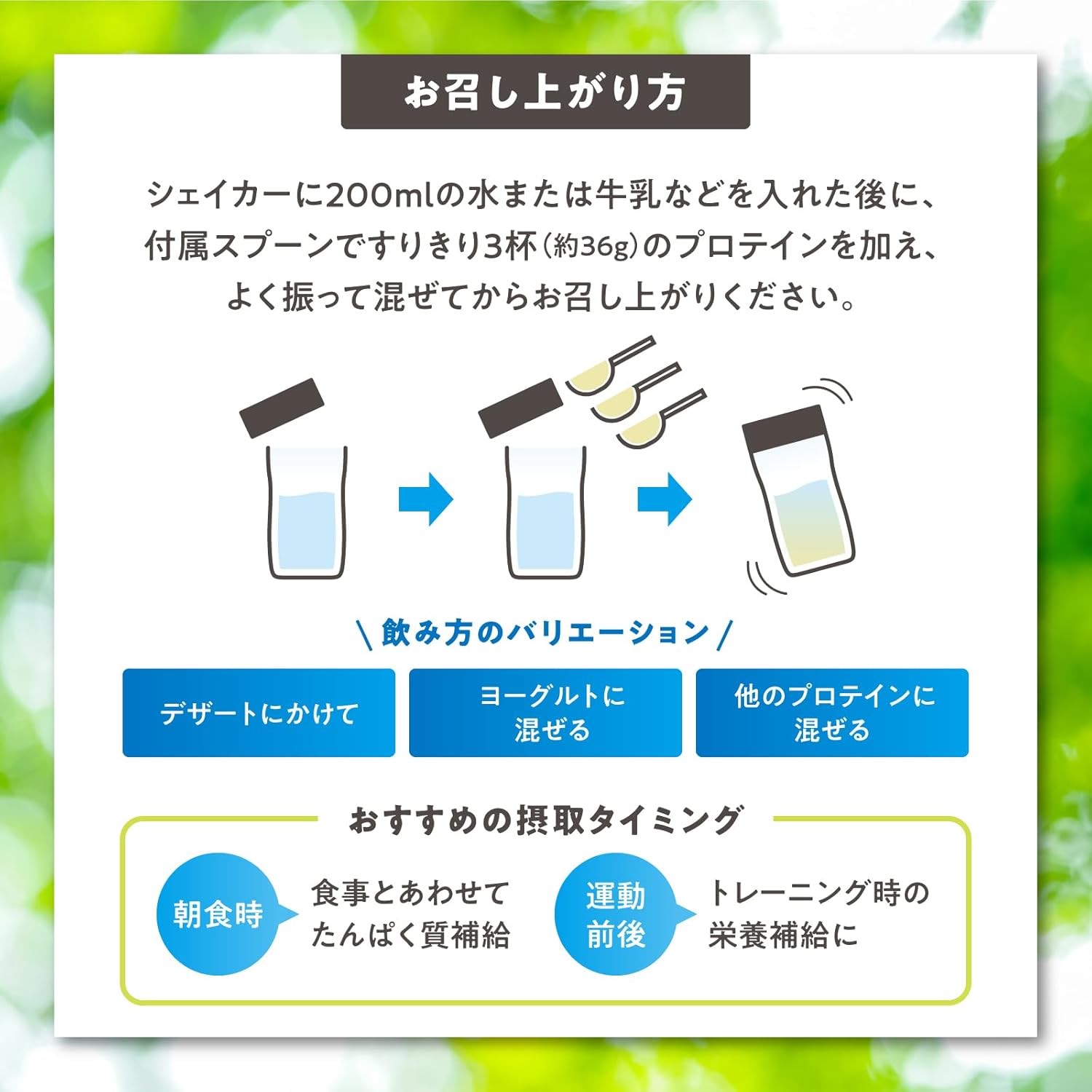 Previous page 飲み方のバリエーション ・デザートにかける ・ヨーグルトに混ぜる ・他のプロテインに混ぜる お召し上がり方 シェイカーに200mlの水または牛乳などを入れた後に、 付属スプーンですりきり3杯(36g)のプロテインを加え、 よく振って混ぜてからお召し上がりください。 おすすめの摂取タイミング 朝食時/運動・トレーニング前後 Next page