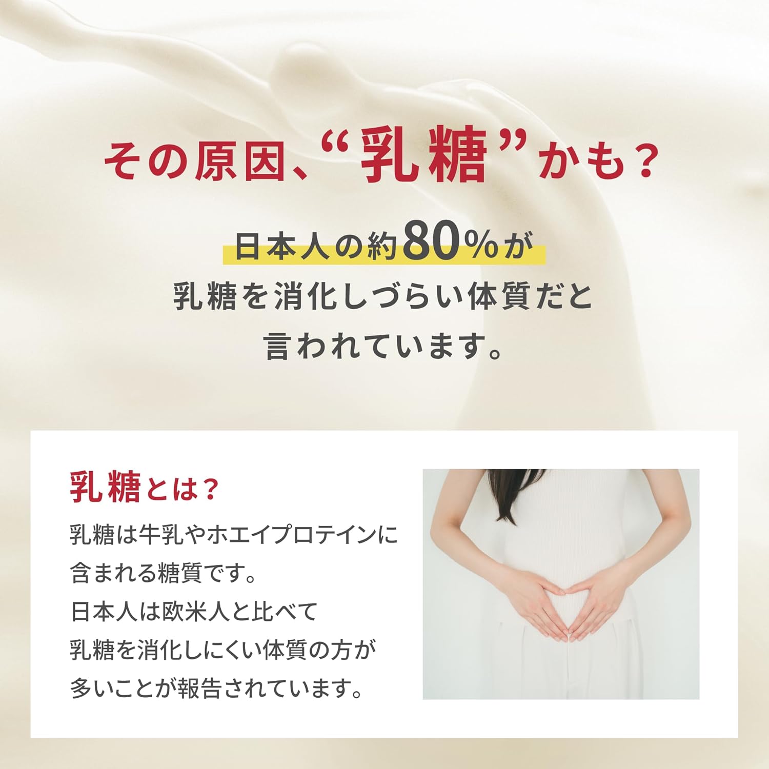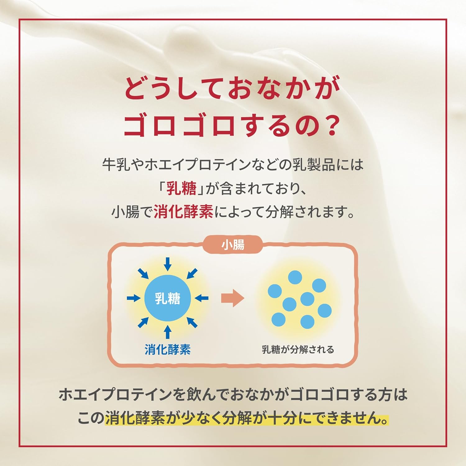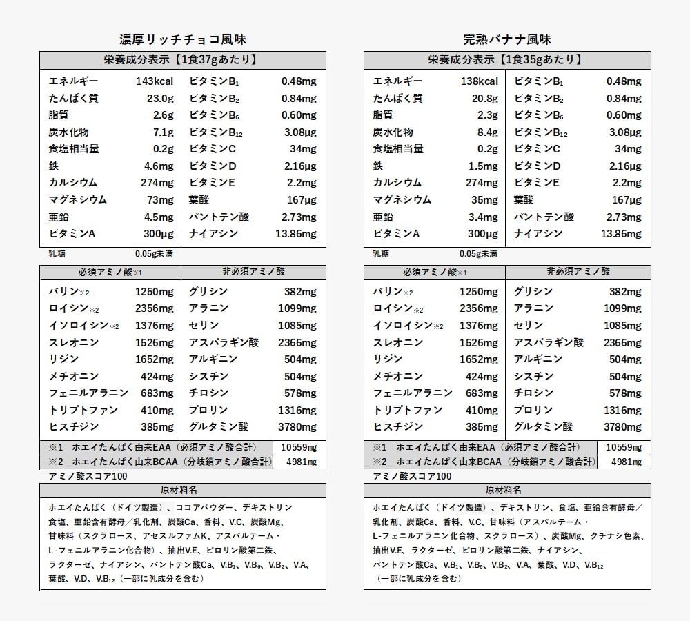 乳糖が約99%分解されているホエイプロテインを使用しております。乳糖は牛乳やホエイプロテインに含まれている糖質で、日本人の約80%が乳糖を消化しづらい体質だと言われています。 乳糖とはなんですか? 乳糖は牛乳やホエイプロテインに含まれる糖質です。 日本人は欧米人と比べて乳糖を消化しにくい体質の方が多いことが報告されています。 なぜバナナ風味とチョコ風味で1食当たりの量が違うのですか? 副原料の関係で、バナナ風味とチョコ風味ではかさ比重が異なるためです。お客様にとって量りやすいように両風味共スプーンすりきり3杯に調整しております。 腎臓に影響はありますか? タンパク質摂取による腎臓へ及ぼす影響については、明確な根拠がございません。 しかし、極端な過剰摂取は体に負担がかかり影響を及ぼす可能性がございますので、腎臓に疾患のある方は使用にあたって医師にご相談いただくよう、アドバイスをさせていただいております。