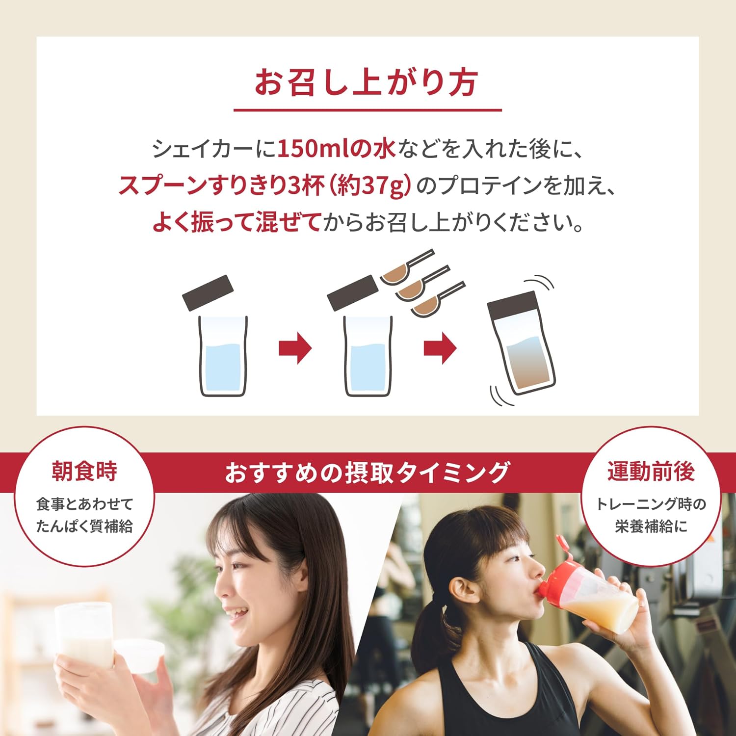 Previous page お召し上がり方 シェイカーに150mlの水などを入れた後に、 付属スプーンすりきり3杯のプロテインを加え、 よく振って混ぜてからお召し上がりください。 おすすめの摂取タイミング 朝食時や運動前後の摂取がおすすめです。 Next page