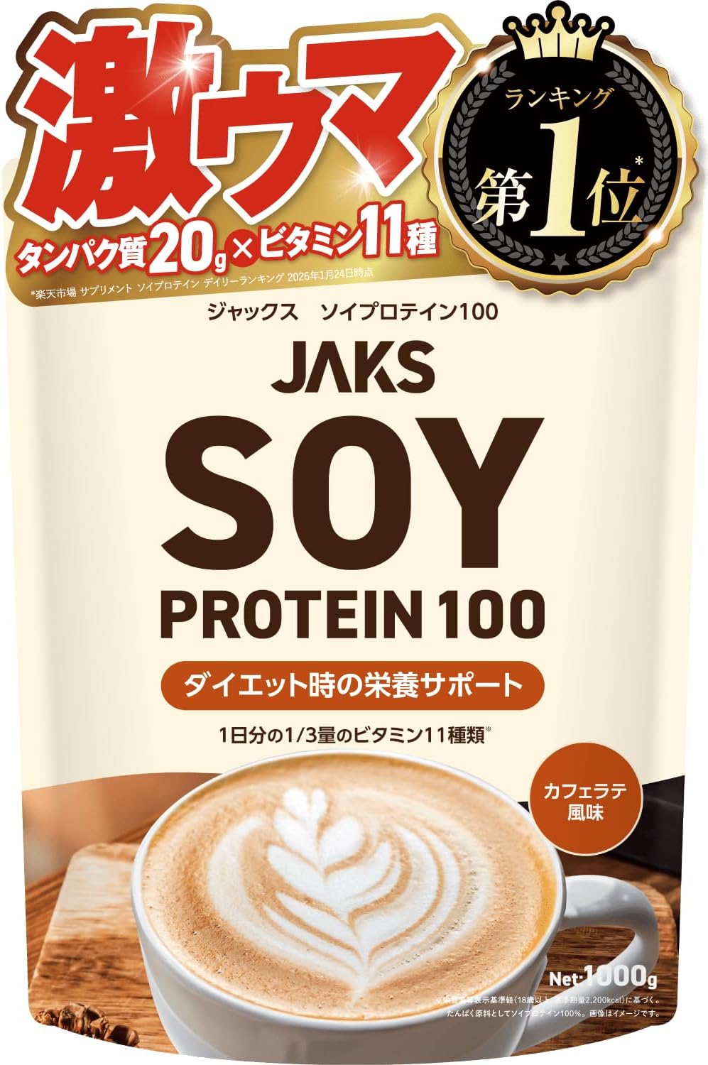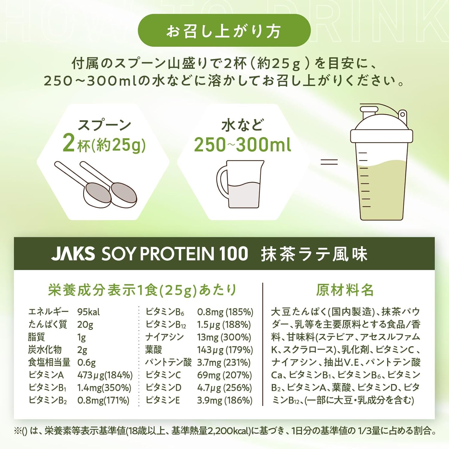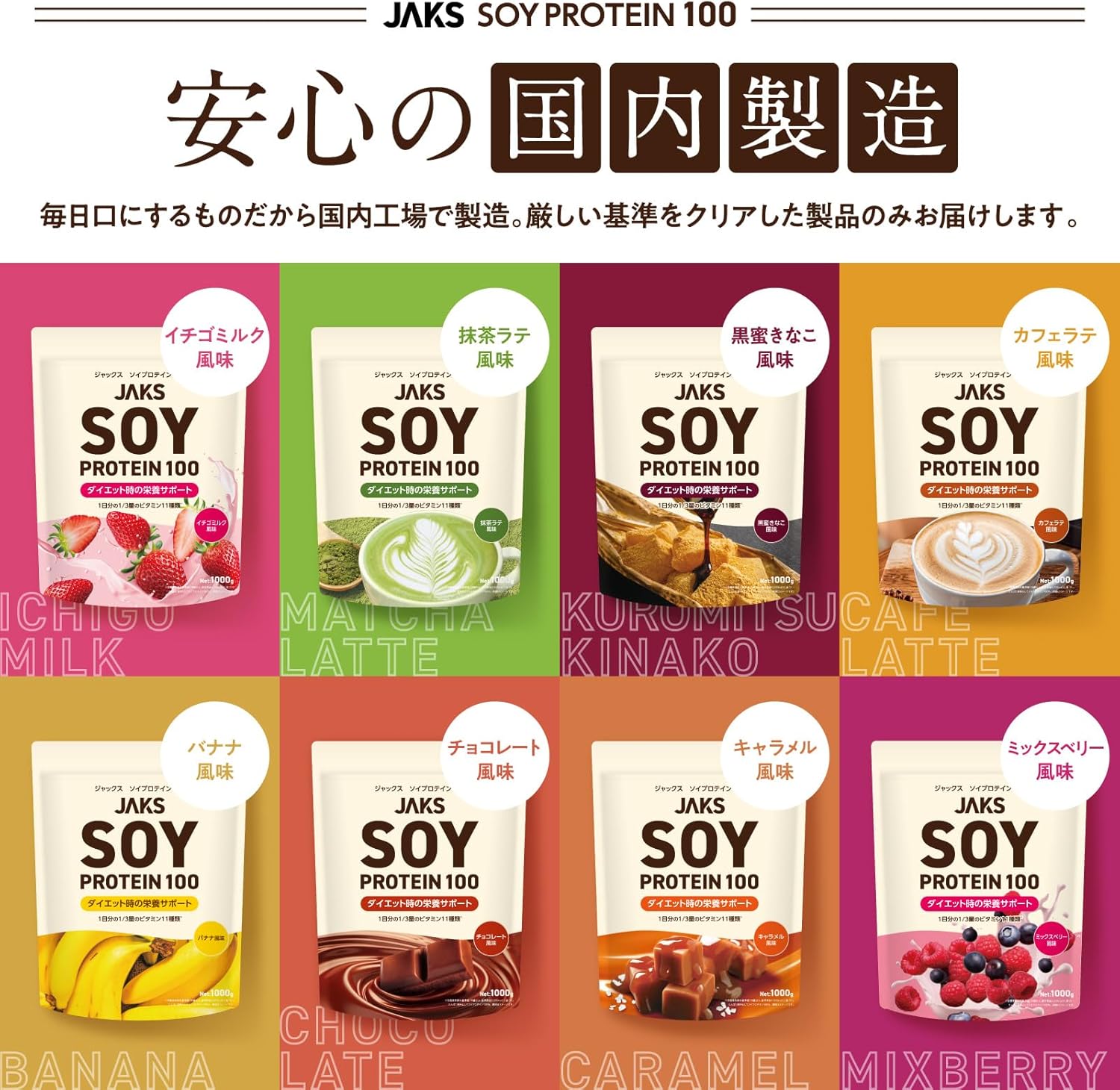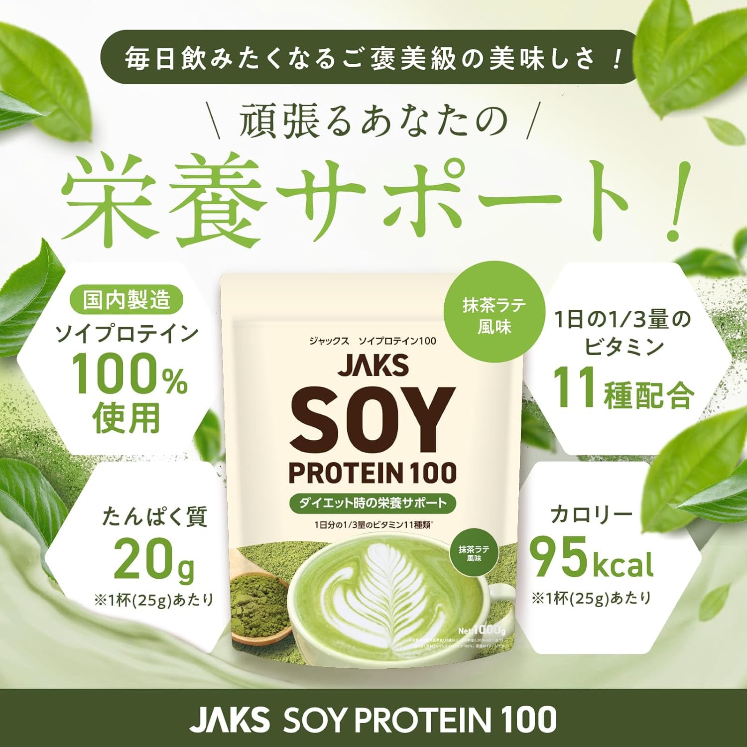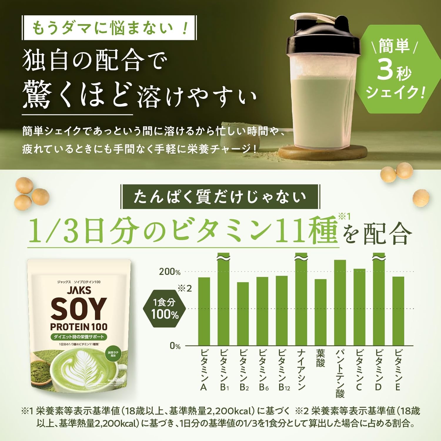 【溶けやすい】 ジャックス JAKS ソイプロテイン 1kg (国産大豆たんぱく原料使用) おいしい 国内製造 ダイエット 1食分のビタミン11種類 オールインワン配合 SOY 高たんぱく質 粉末 大豆たんぱく ダマになりにくい (1kg, 抹茶ラテ)