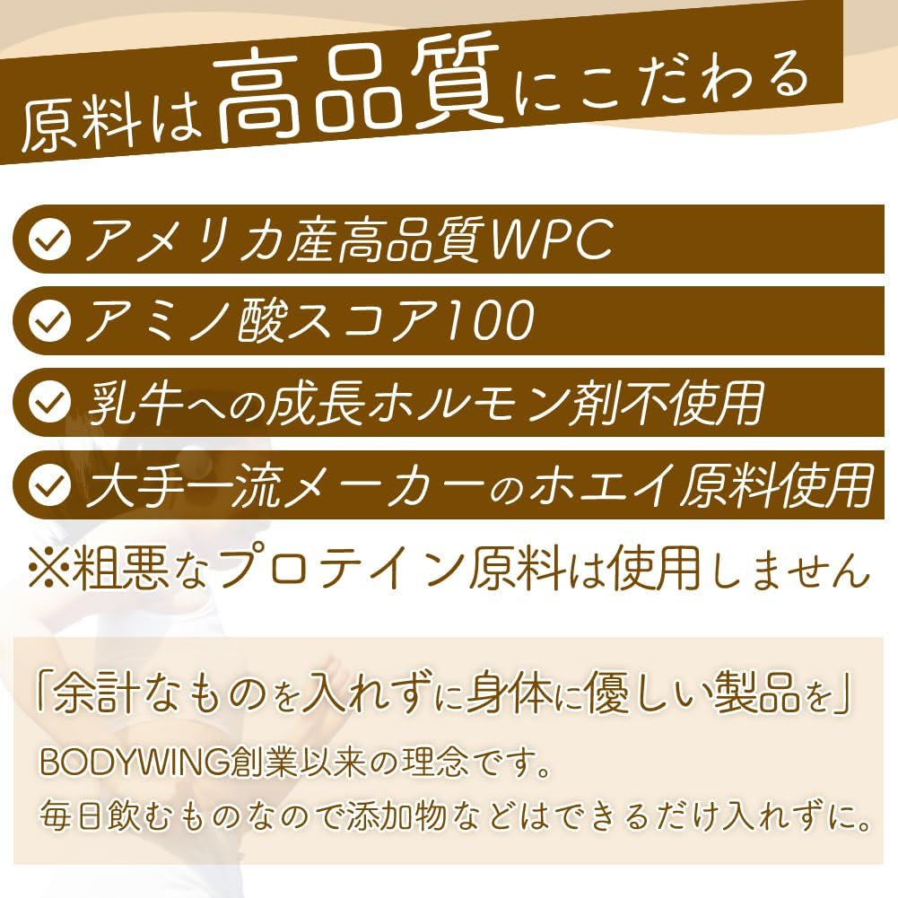 - •アミノ酸スコア100、乳牛への成長ホルモン剤不使用の高品質なアメリカ産WPCホエイプロテイン100%使用。