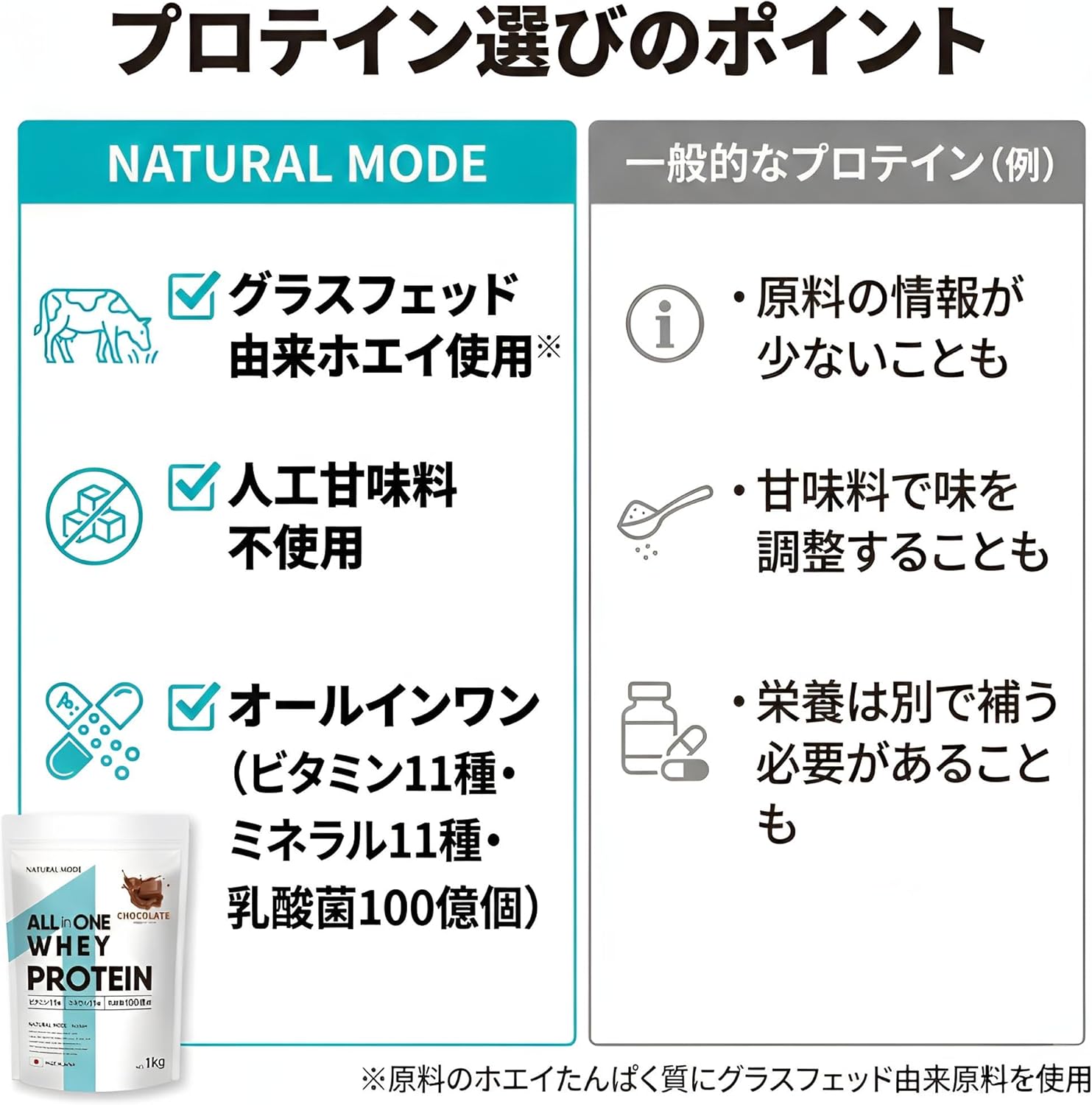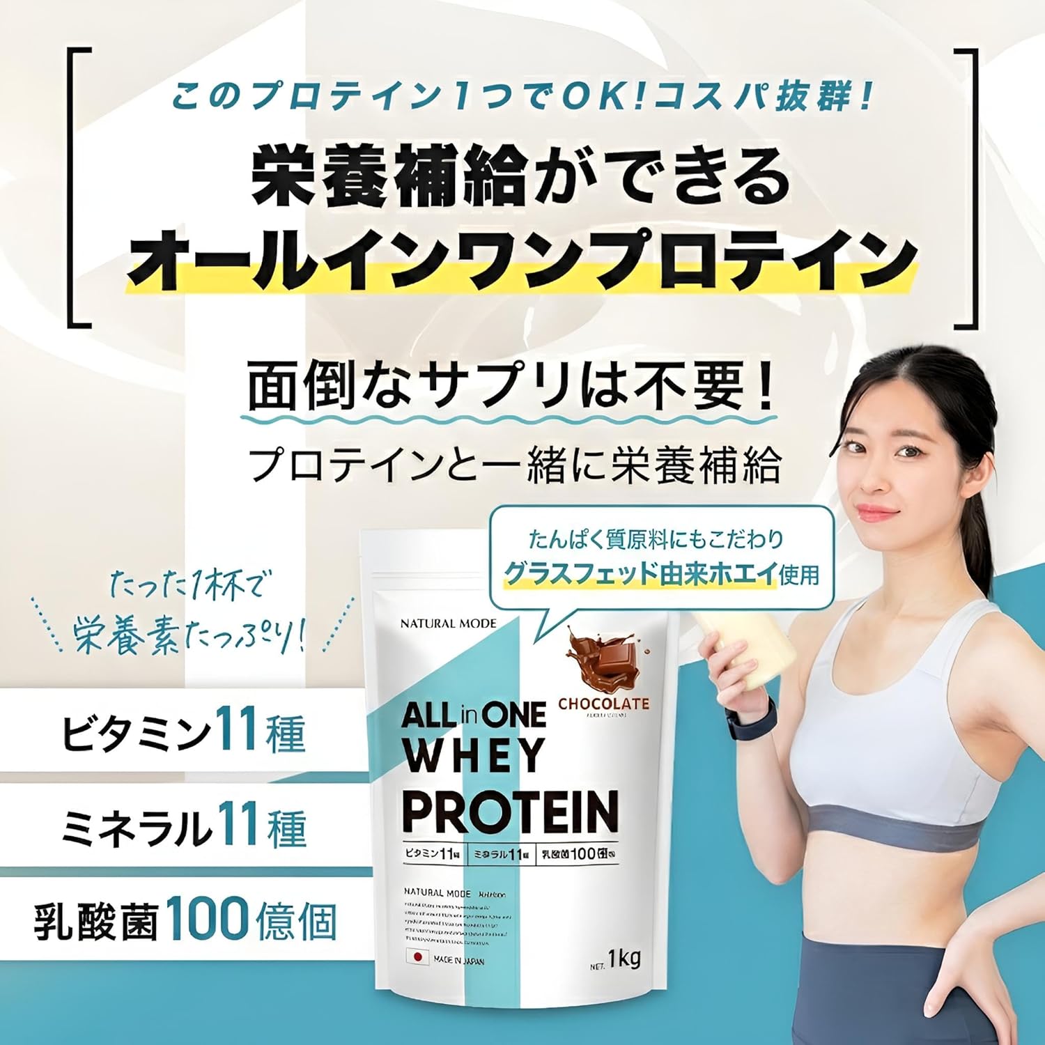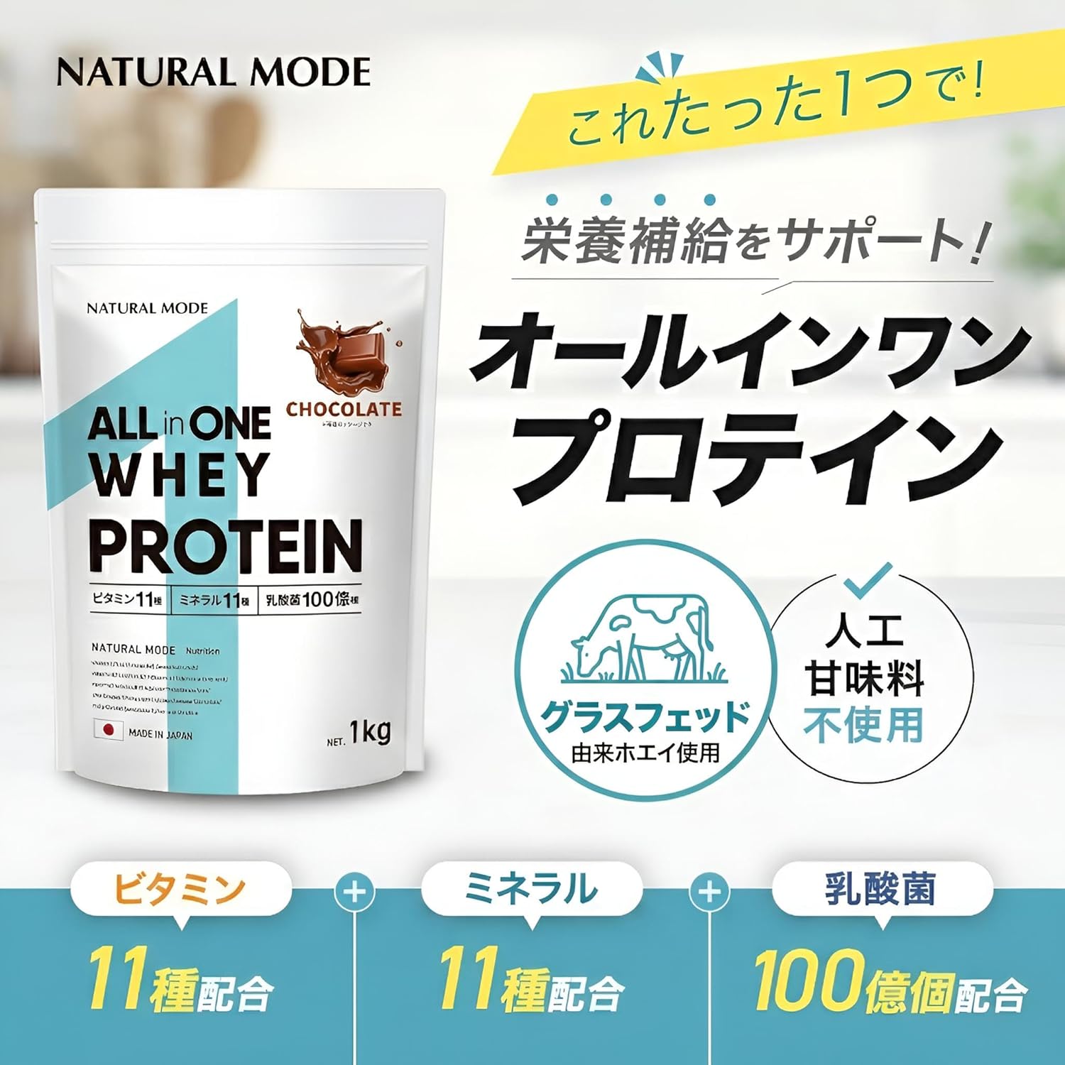 【これ1つで栄養補給をサポート】 NATURAL MODEのオールインワンホエイプロテインは、1食(30g)あたりビタミン11種・ミネラル11種・乳酸菌100億個を配合。プロテインと一緒に、不足しがちな栄養もまとめて補給できる“オールインワン設計”です。忙しい朝の栄養サポートや、運動後のたんぱく質補給にもおすすめです。 【グラスフェッド由来ホエイ使用】 毎日飲むものだからこそ、たんぱく質の“質”にもこだわりました。たんぱく質原料(ホエイたんぱく質)に、グラスフェッド由来原料を使用しています。 ※「グラスフェッド=牧草を主食とする牛由来」の一般説明は入れてOKですが、断定表現が増えるとリスクなので“由来原料を使用”に留めています。 【人工甘味料不使用/甘さ控えめ】 人工甘味料は使用せず、甘味は植物由来のステビアを少量使用。甘さ控えめで、毎日続けやすい味わいを目指しました。 【飲み方・おすすめシーン】 水・牛乳などお好みで割ってお召し上がりください。 ・朝食の置き換えや栄養サポートに ・間食の一杯に ・運動後のたんぱく質補給に