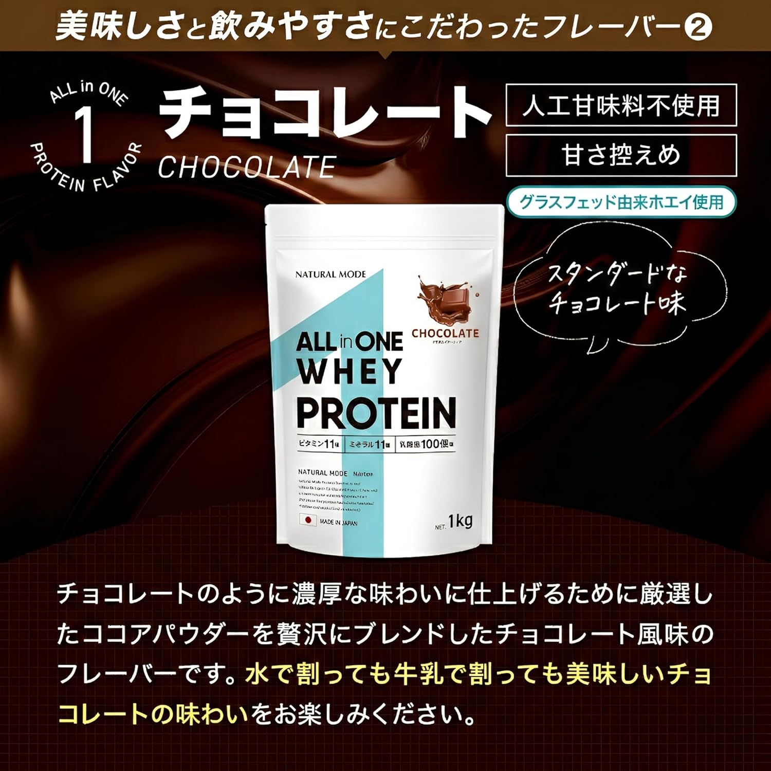 ホエイプロテイン 1kg WPC グラスフェッド由来 オールインワン 人工甘味料不使用(植物由来ステビア)着色料・乳化剤不使用 NATURALMODE (チョコレート)