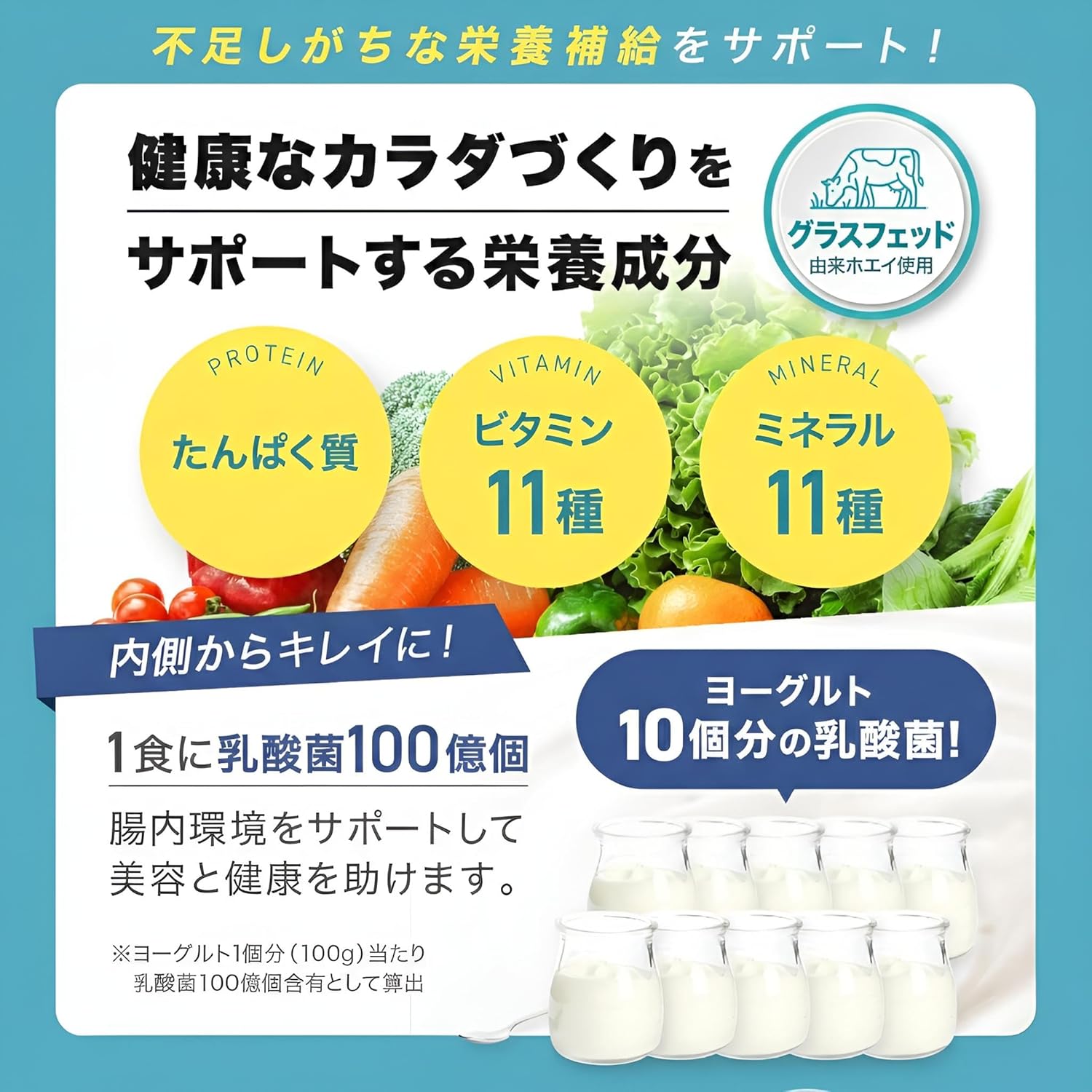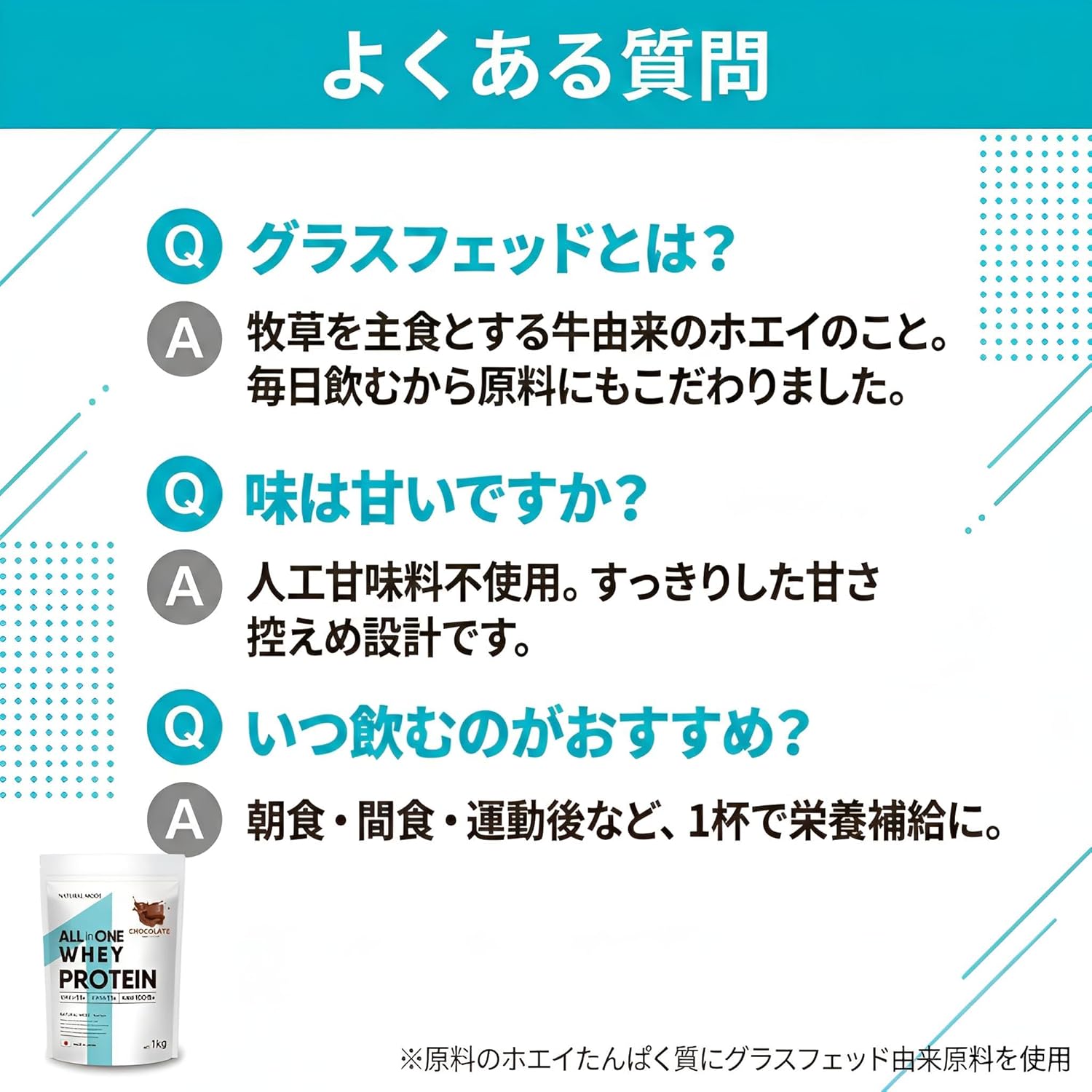 - •✅【グラスフェッド由来ホエイ使用(WPC)】たんぱく質原料(ホエイたんぱく)にグラスフェッド由来原料を使用。毎日飲むものだから、原料にもこだわったホエイプロテイン(WPC)です。