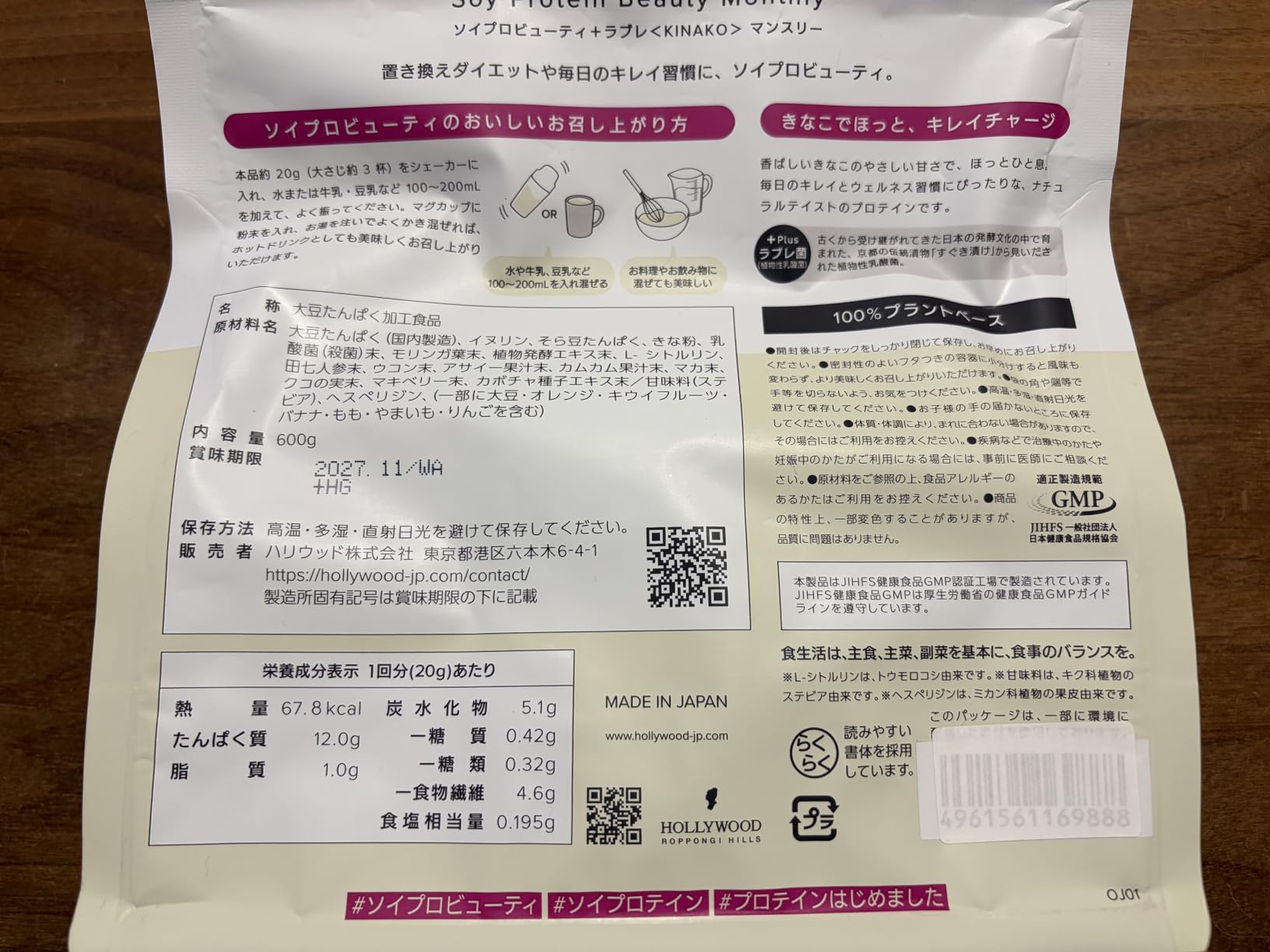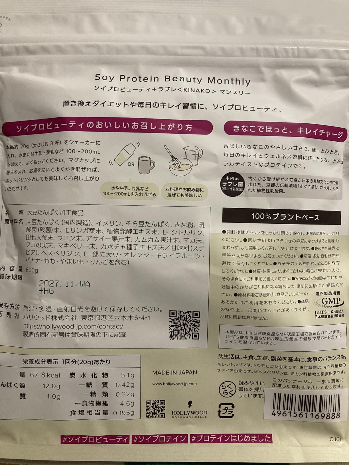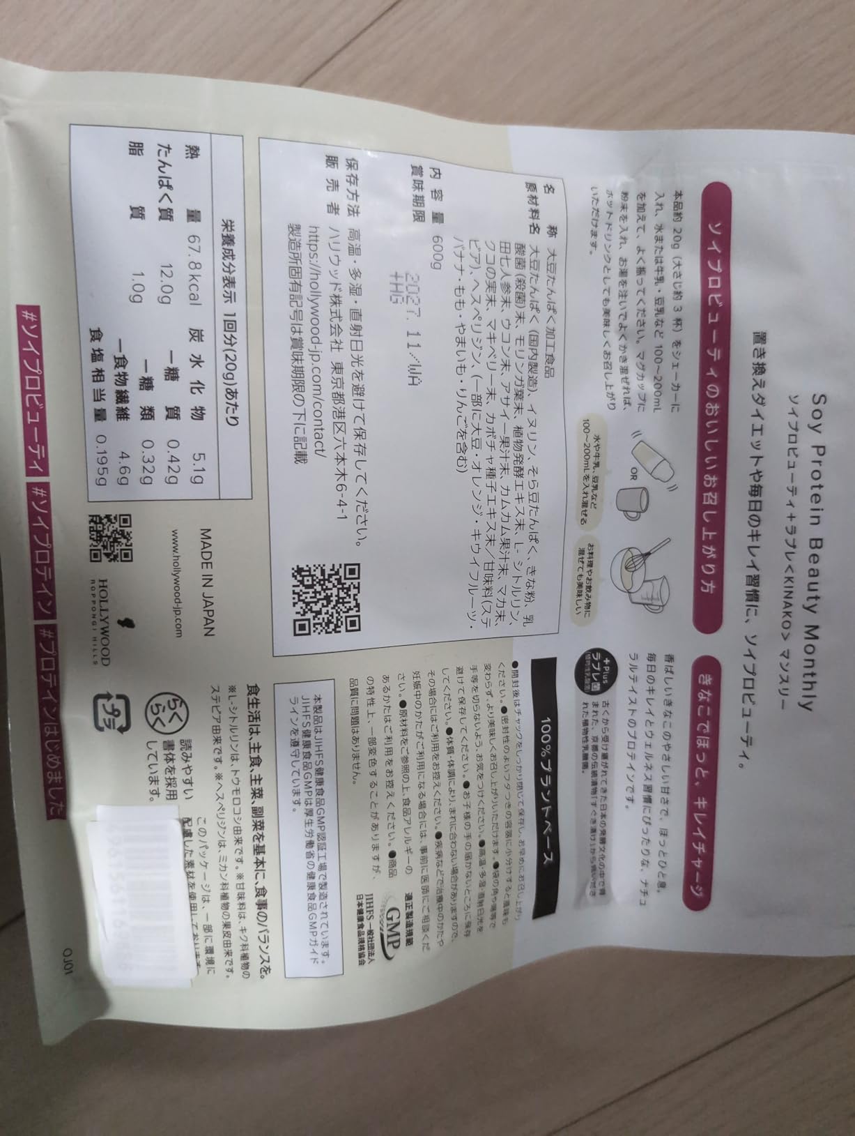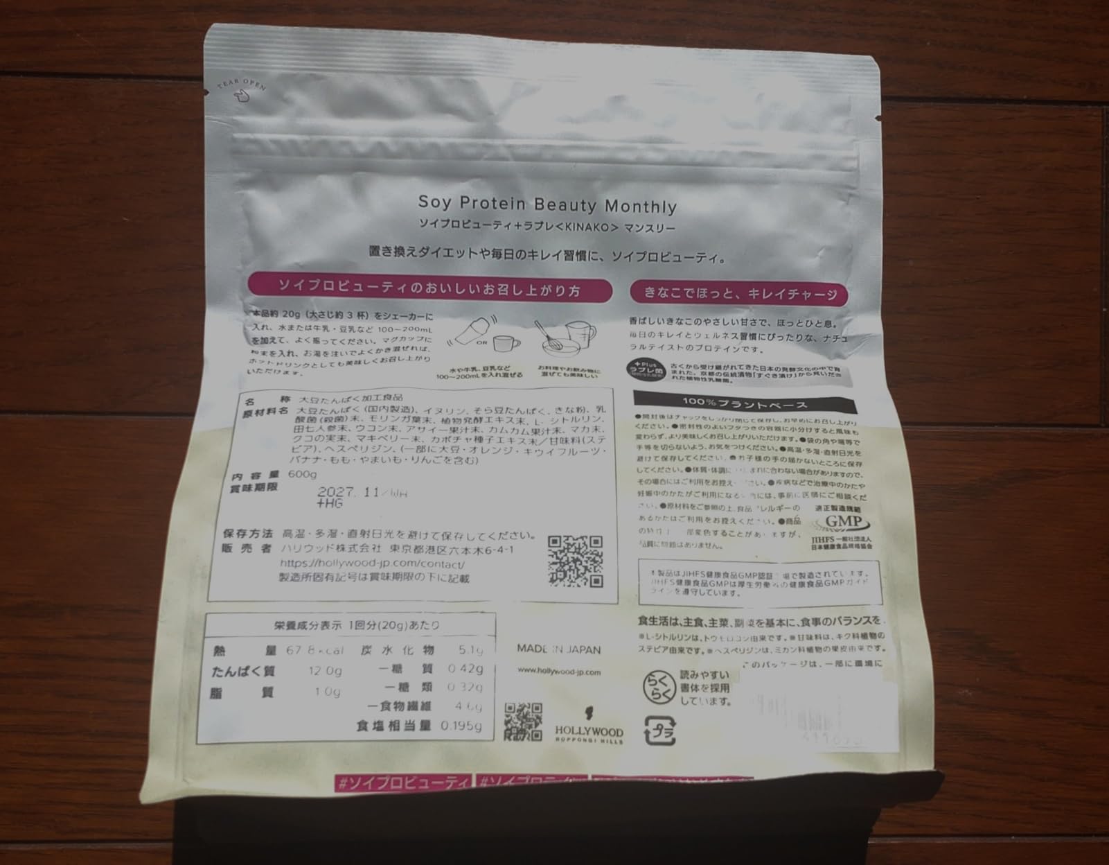 【原材料 / 成分】 大豆たんぱく(国内製造)、難消化性デキストリン、そら豆たんぱく、きな粉、モリンガ葉末、植物発酵エキス末、L-シトルリン、田七人参末、ウコン末、アサイー果実末、カムカム果汁末、マカ末、クコの実末、マキベリー末、カボチャ種子エキス末/甘味料(ステビア)、ヘスペリジン、(一部に大豆・オレンジ・キウイフルーツ・バナナ・もも・やまいも・りんごを含む) 【栄養成分表示1回分(20g)あたり】熱量 77.4kcal / たんぱく質 10.0g / 脂質 0.8g / 炭水化物 7.5g / 食塩相当量 0.2g ※L-シトルリンはトウモロコシ由来です ※甘味料は、キク科植物のステビア由来です ※へスペリジンは、ミカン科植物の果皮由来です