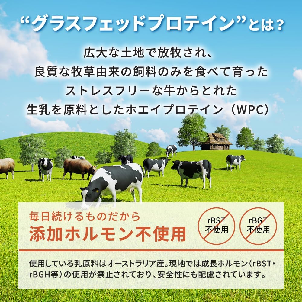 - •⭐【グラスフェッドプロテインとは】良質な牧草由来の飼料を食べて育った牛からとれた、生乳を原料としたホエイプロテイン(WPC)。