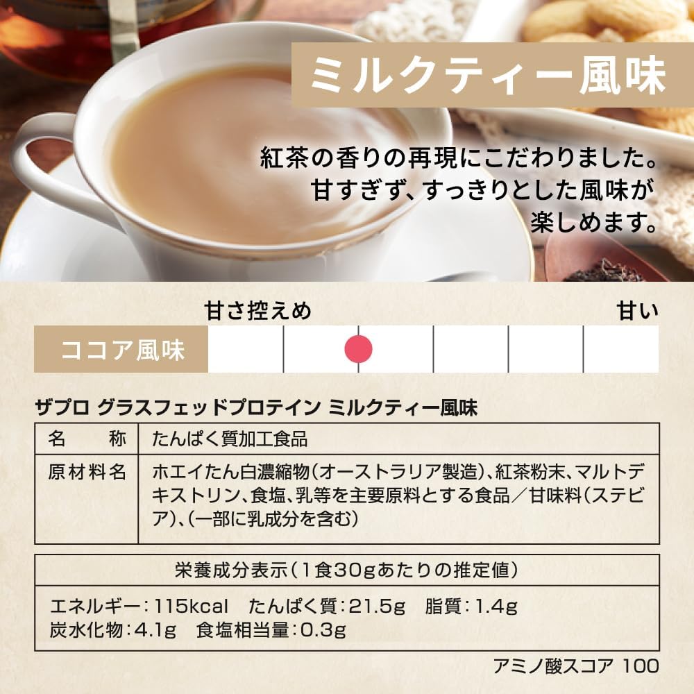 ザプロ グラスフェッドプロテイン 原材料・成分 ホエイたん白濃縮物(オーストラリア製造)、紅茶粉末、マルトデキストリン、食塩、乳等を主要原料とする食品/甘味料(ステビア)、(一部に乳成分を含む)